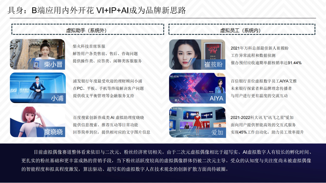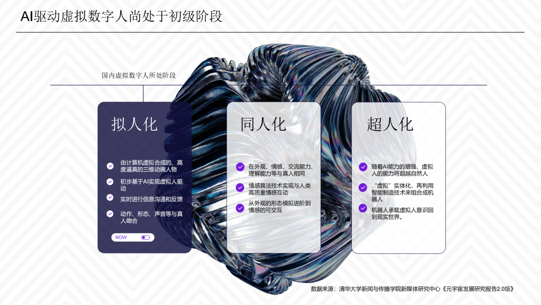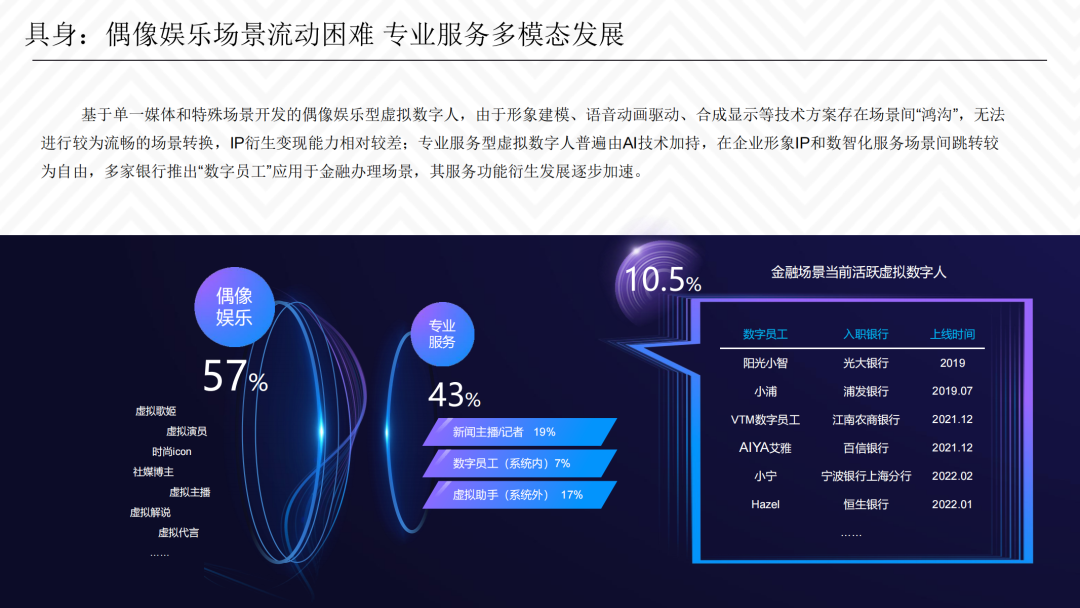 报告指出,随着互联网软硬件技术发展逐步成熟,在“元宇宙”概念成为热点的同时,虚拟数字人产业也进入“爆发期”。但无论从技术整合、场景应用和营销模式来看,元宇宙层面的虚拟数字人发展目前尚处于初级阶段。